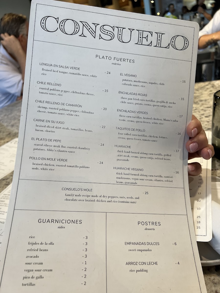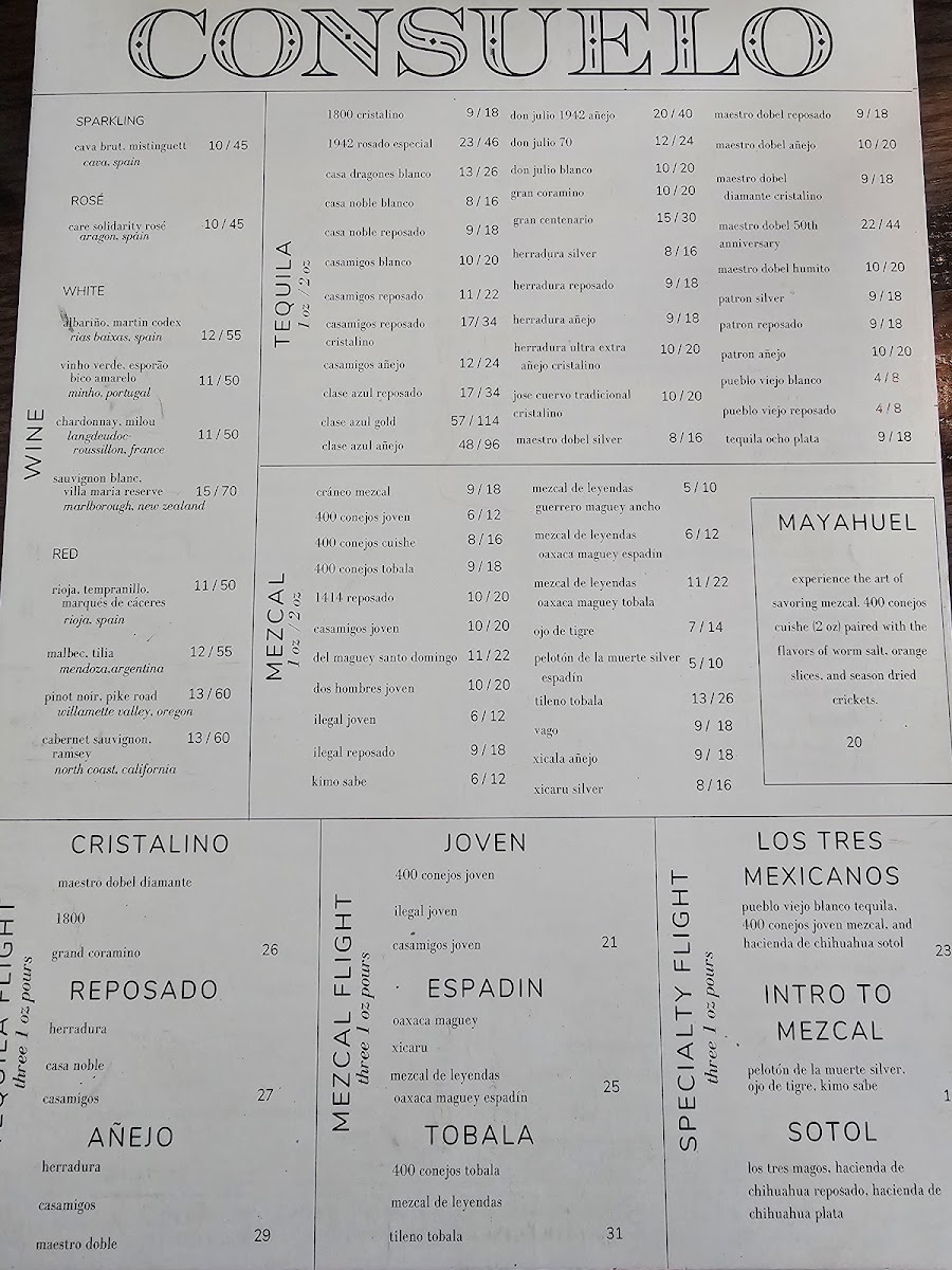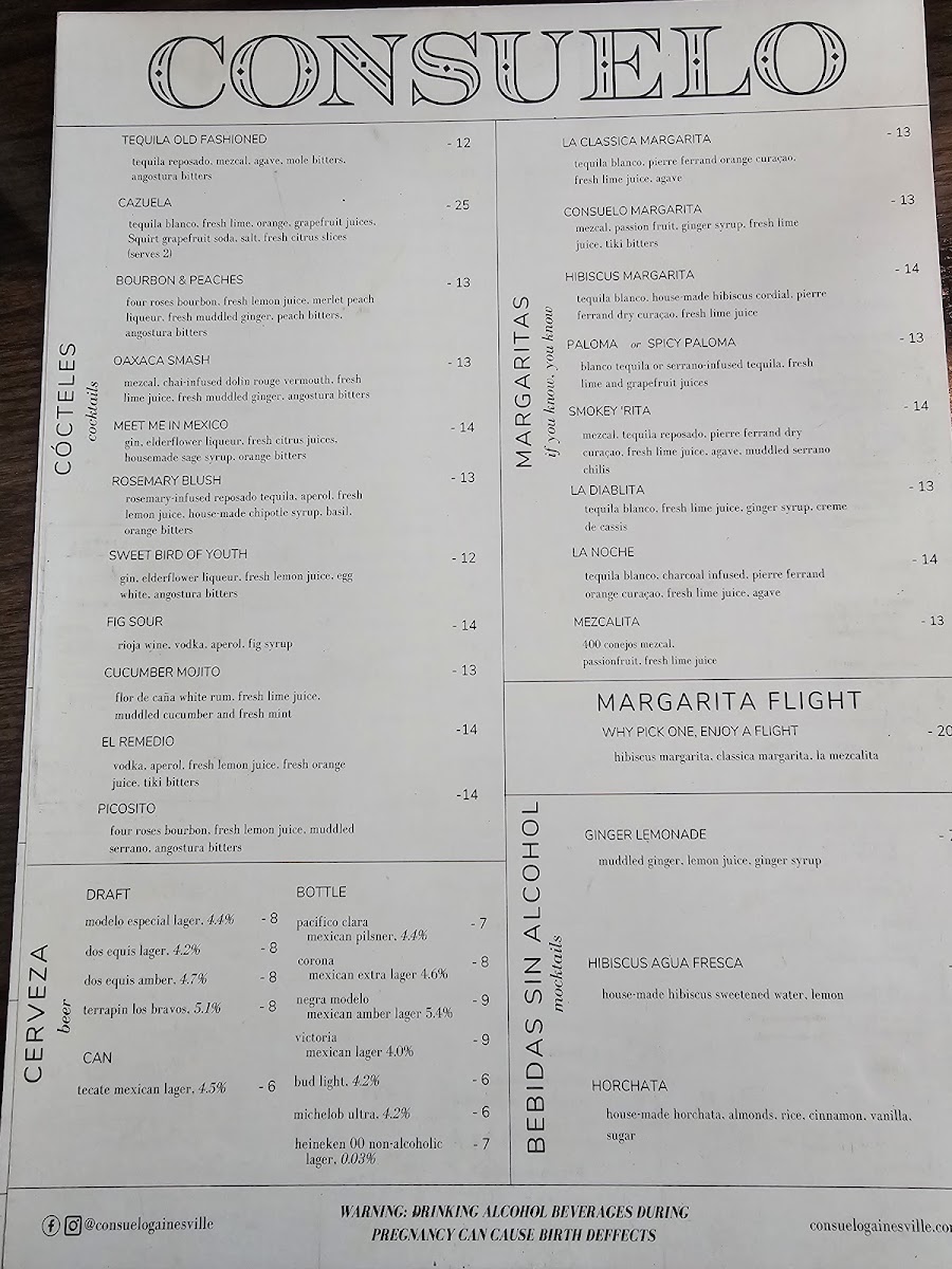 Introducing the menu at Consuelo, a culinary gem nestled in Gainesville, GA, where every dish is a celebration of authentic Mexican flavors crafted from scratch. This vibrant eatery radiates warmth, creating a welcoming atmosphere that invites you to indulge. The highlight of the menu includes the mahi ceviche—a refreshing, expertly prepared dish that maintains its delightful freshness, and the tantalizing mole that showcases a rich blend of spices and flavors. For meat lovers, the cochinita pork, marinated for 24 hours to ensure tender, flavorful bites, is a must-try. Don't miss out on the impressive margarita flight, providing a unique twist that will elevate your dining experience. The attentive staff, like the knowledgeable Santiago, enhance your visit by helping navigate the menu with personalized recommendations. Whether for a casual night out or a special occasion, Consuelo embodies an unparalleled dining experience that captivates both locals and visitors alike.